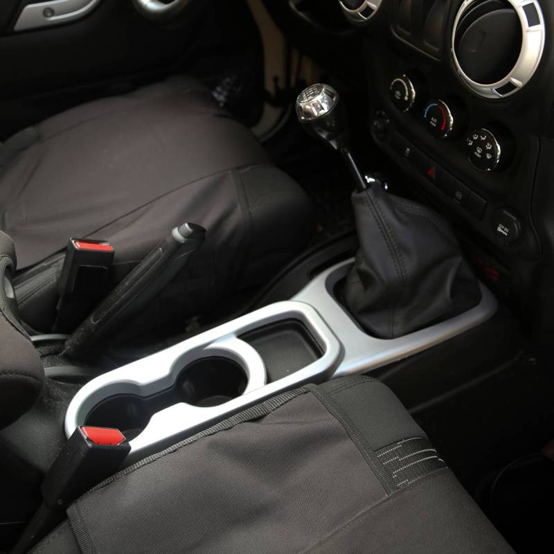 This brushed silver trim from Rugged Ridge fits the center console cup holders on 11-16 Jeep Wrangler with a manual transmission.