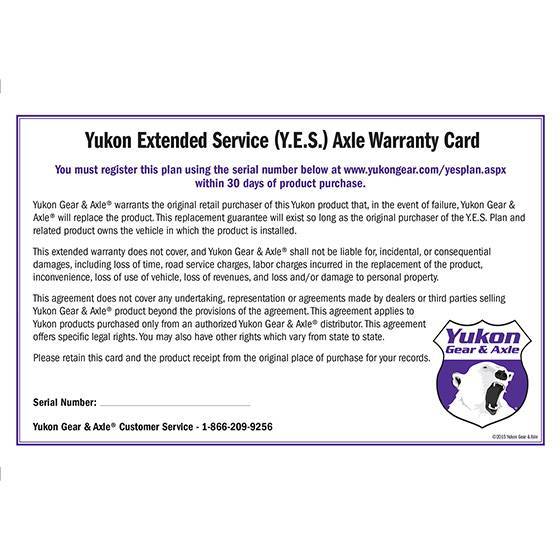 The Yukon Extended Service Plan (YES Plan) is a no questions asked, guaranteed one-time replacement warranty for your Yukon axle shafts. This lifetime protection plan is good for as long as you own the vehicle. It is non-transferrable if the vehicle is sold. The plan guarantees repair or replacement of the indicated Yukon product and is not transferrable if the vehicle is sold. Should a problem arise with a registered product the purchaser simply contacts Yukon Gear & Axle® directly and provides the YES Plan-issued serial number to initiate service. This extended warranty does not cover, and Yukon Gear & Axle shall not be liable for, incidental or consequential damages, including loss of time, roadside service charges, labor charges incurred in the replacement of the product, inconvenience, loss of vehicle use, loss of revenues, and loss and/or damage to personal property. The YES Plan can be purchased up to one month after the Yukon product has been purchased. Yukon offers the YES Plan for third members, axles, ring and pinion gear sets, lockers, performance driveshafts, and the Dura Grip limited slip differential. When you believe in your products this is how you back them up!