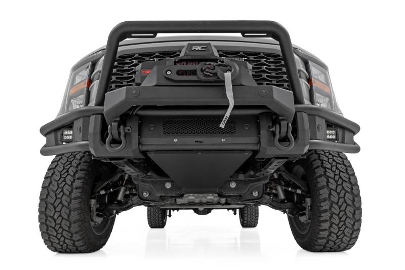 Take your truck's off-road capability and style to the next level with this rugged, trail-ready upgrade. Built for performance and designed to turn heads, this bumper is ready for any adventure.Sleek & Bold Design: Constructed with durable 2-inch diameter tubing and finished in a corrosion-resistant Satin Black coating, this bumper delivers a bold, aggressive look that complements your F-150's rugged stance.Trail-Ready Strength: Equipped with a heavy-duty D-ring set boasting a massive 4.75-ton capacity, this bumper provides reliable recovery points for your toughest adventures.Ultimate Off-Road Protection: An integrated skid plate shields vital components from rocks, debris, and rough terrain, while the bolt-on stinger bar enhances front-end protection and style.Built-In Light Bar Mount: The stinger bar isn't just for protection - it also functions as a sturdy mount for an LED light bar, giving you the flexibility to enhance nighttime visibility on the trails.With bold styling, unbeatable strength, and essential off-road features, Rough Country's Front Tubular Bumper is the game-changing upgrade your F-150 deserves. Ditch the stock look and conquer the trails with confidence!